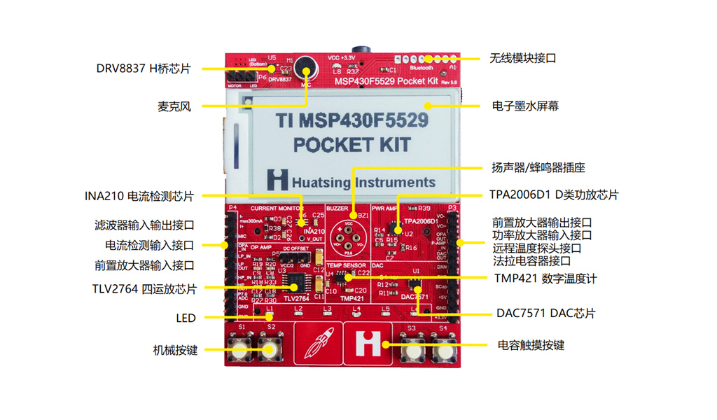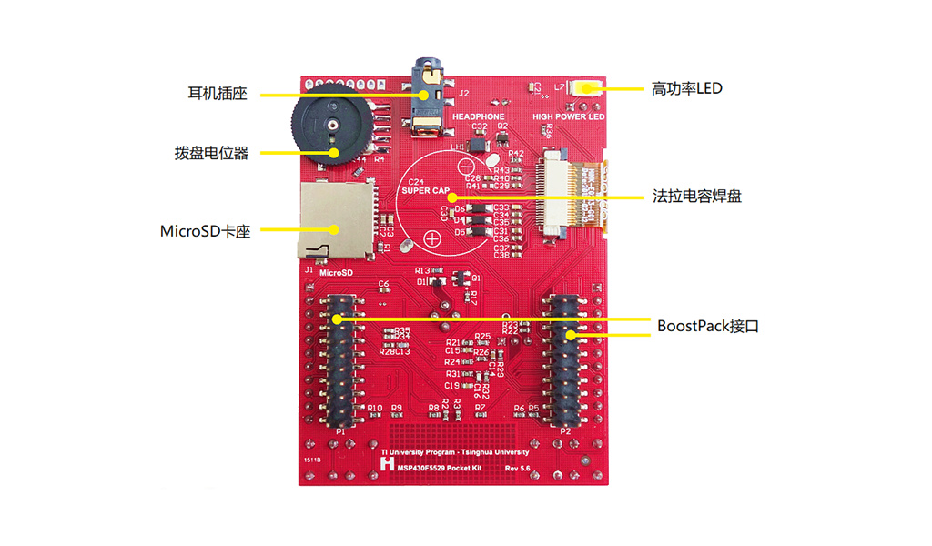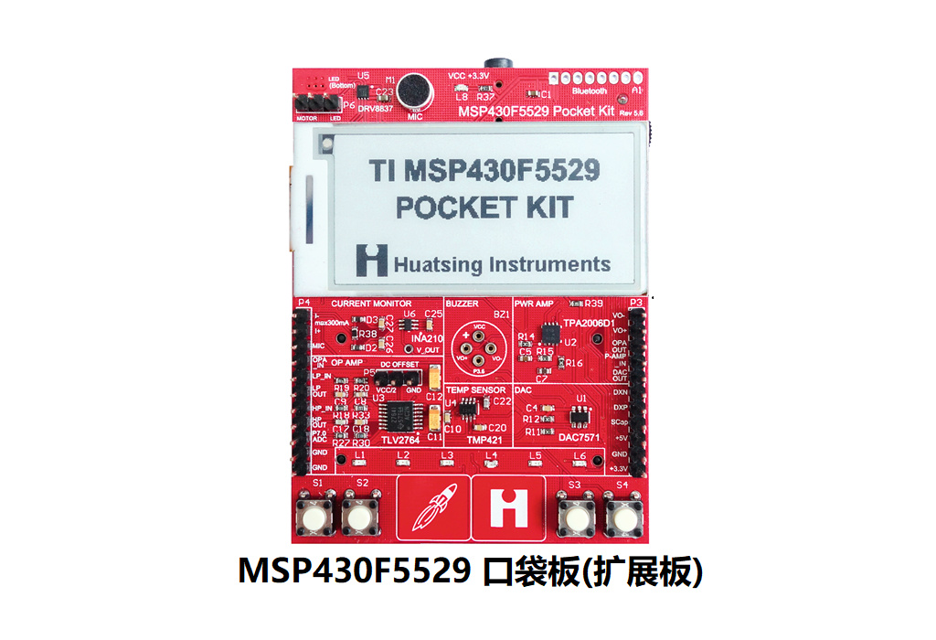 MSP430F5529口袋板套件由核心板與擴展板兩部分組成。核心板為TI MSP430F5529 LaunchPad,擴展板集成了電子墨水屏、電流檢測芯片、低壓H橋驅動器、四路集成運放、D類功率放大器、串行DAC、雙溫區(qū)數字溫度傳感器等眾多新型模塊及器件。MSP430F5529 口袋板套件可以作為MSP430單片機、微機接口等課程實驗平臺使用,也可以作為各級電賽及科技創(chuàng)新平臺使用。